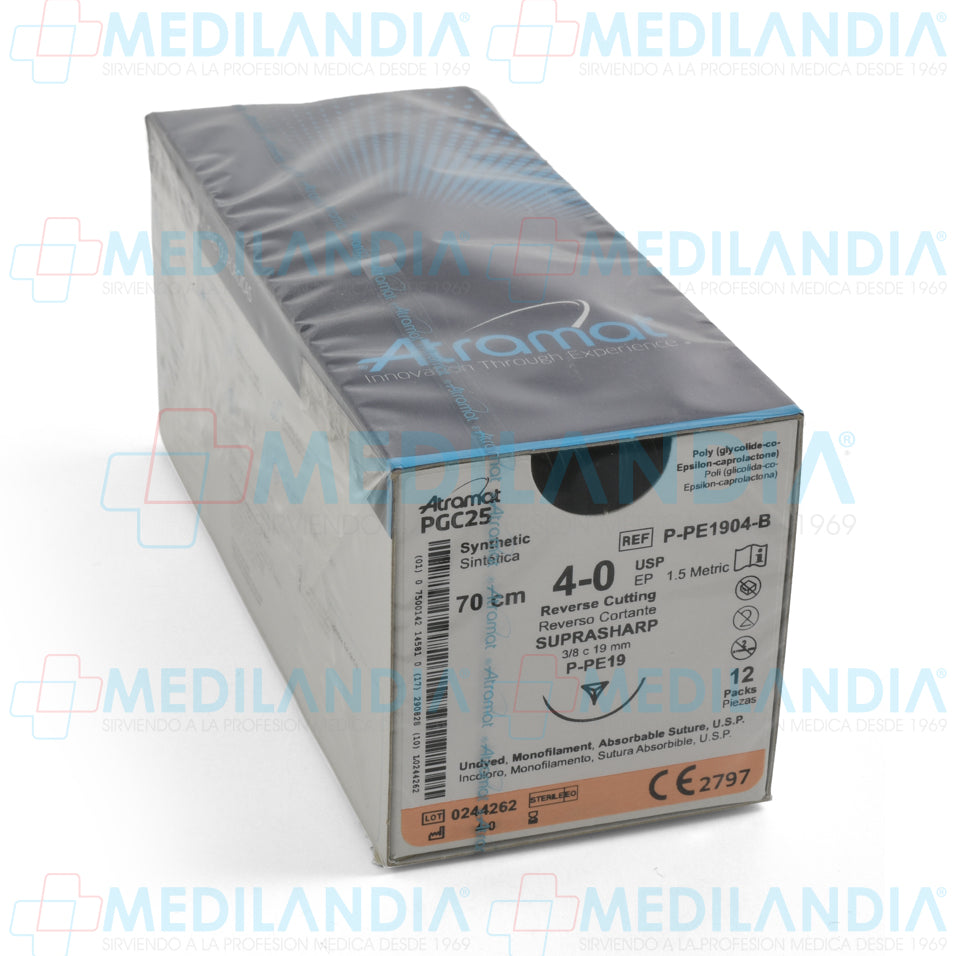 Sutura Poli (glicolida-co-epsilon-caprolactona) (PGC25, Monocryl) incoloro 4 - 0 / EP 1.5 métrico caja con 12 sobres